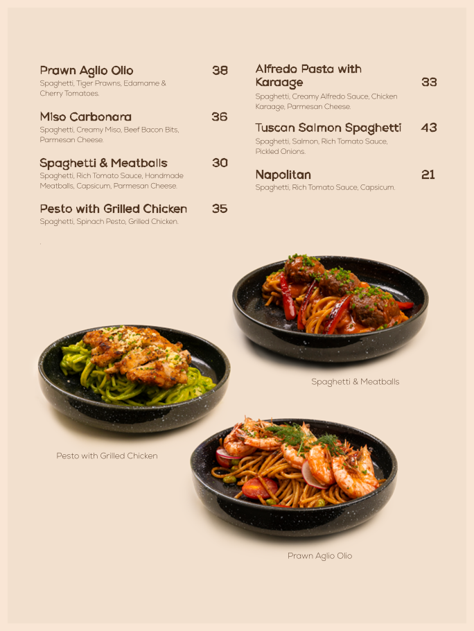 - Noodles: Various noodle dishes are available, featuring different styles and flavors such as Prawn Aglio Olio Spaghetti, Stir Fried Yakisoba, Pesto with Grilled Chicken, Napolitan Spaghetti, and Miso Carbonara.