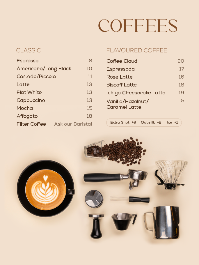 - Crafted Lattes: This section includes specialty coffee beverages with unique flavor infusions such as Biscoff Latte, Pandan Latte, and Rose Latte, all prepared with espresso shots and oat milk.